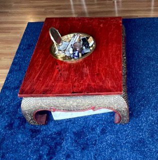 Винтажный журнальный стол в восточном стиле 100% натуральная древесина Украшен и покрыт со всех сторон небольшими кусочками зеркала и цветного стекла, поверх медного покрытия по периметру стола Древесина покрыта лаком насыщенного, темно-красного цвет...