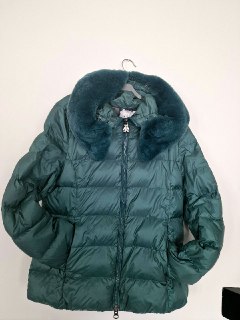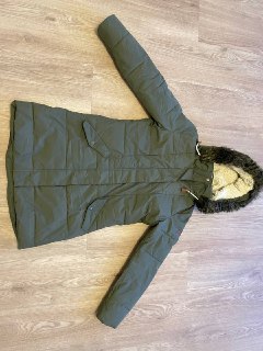 Теплый пуховик. Размер S. Капюшон глубокий и опушка из кролика. Цвет бежевый с оливковым оттенком. 25 евро Алмере или отправка за ваш счет